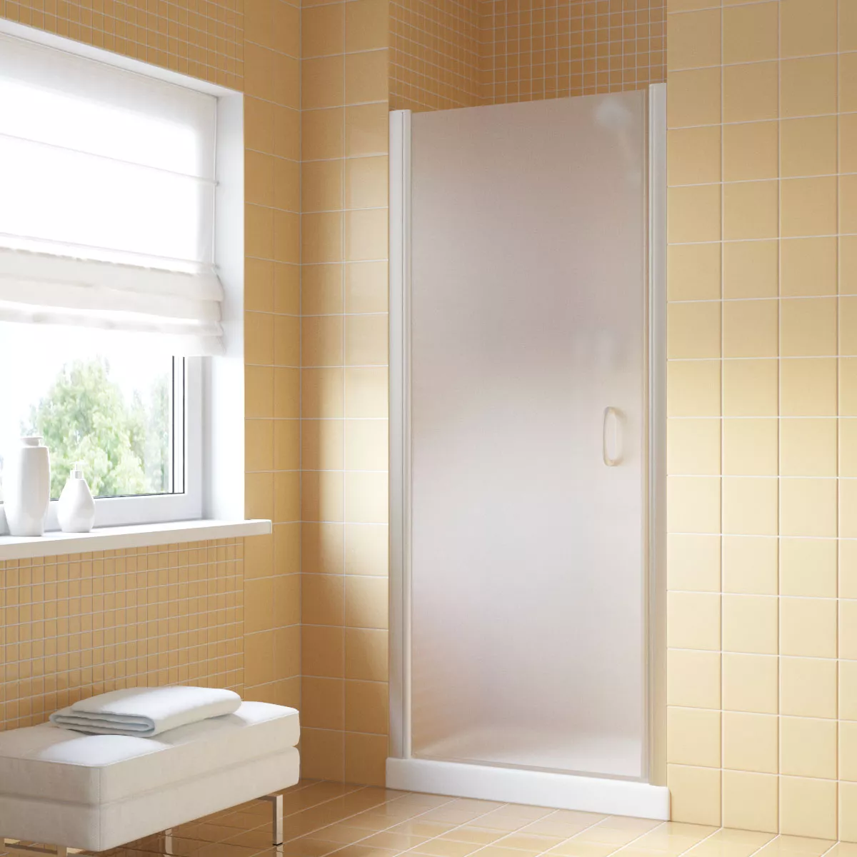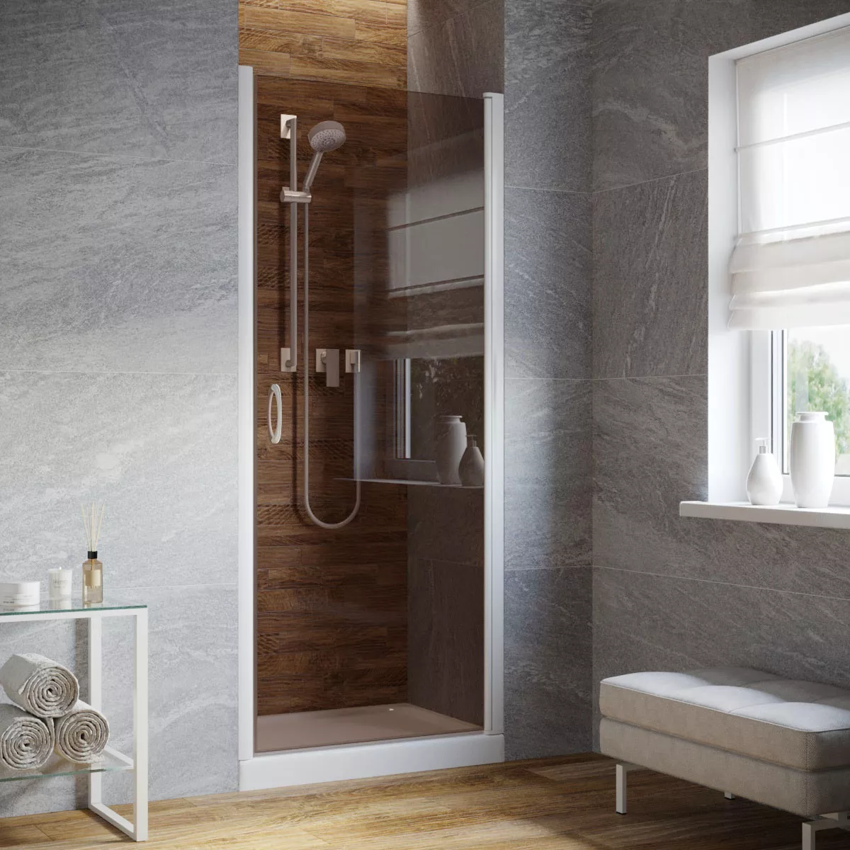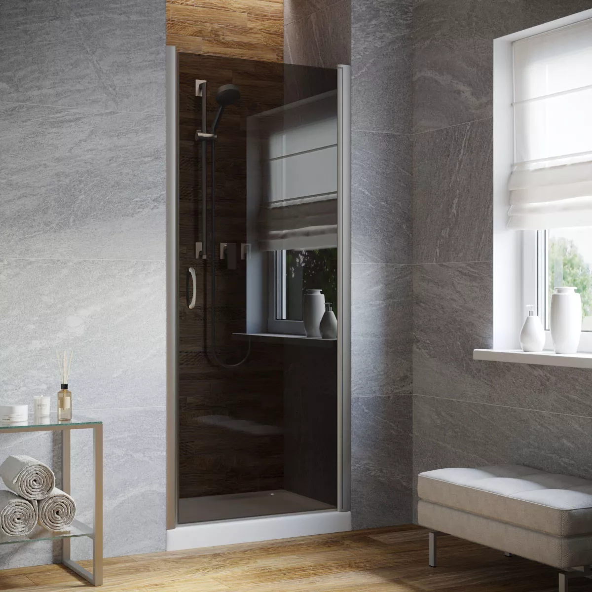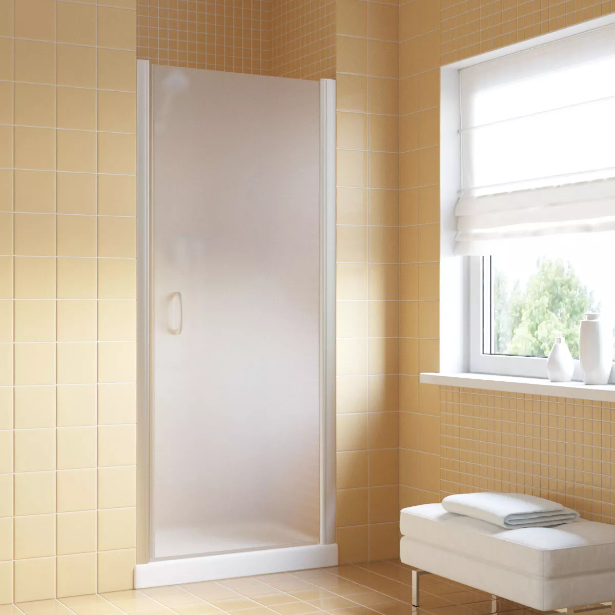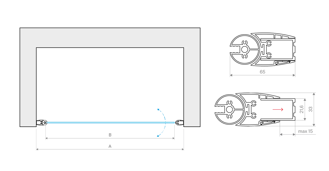 Установка и размеры: Дверь предназначена для установки в нишу, с возможностью регулировки размеров для идеального соответствия нишевому пространству. Размеры двери могут варьироваться, предлагая решения для различных размеров ванных комнат.