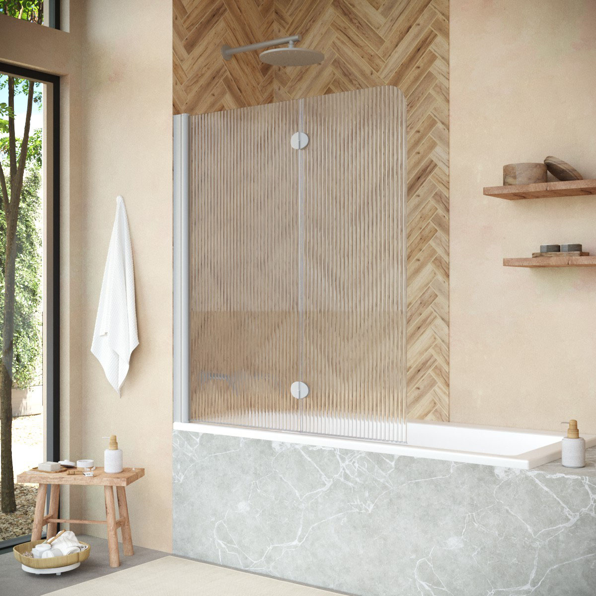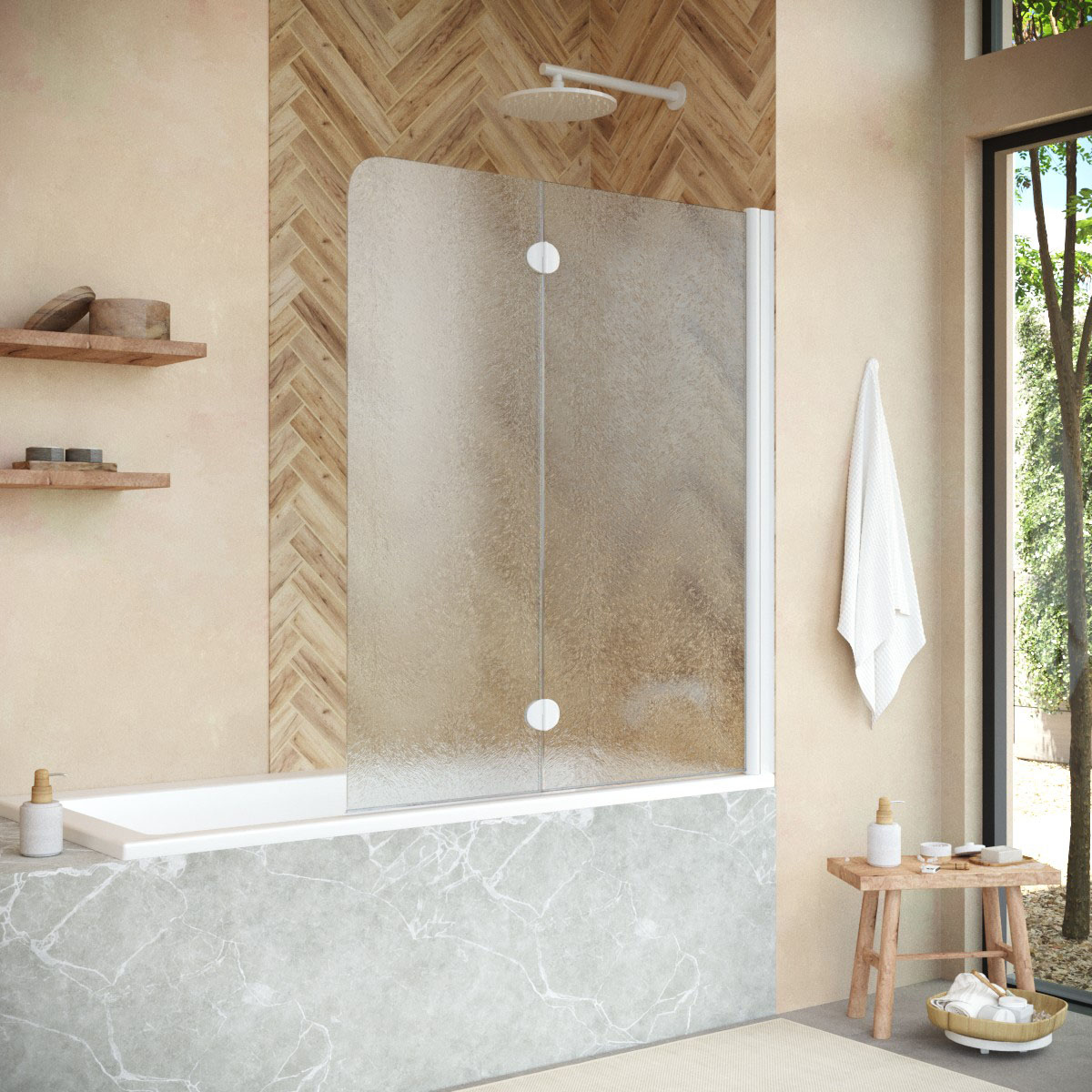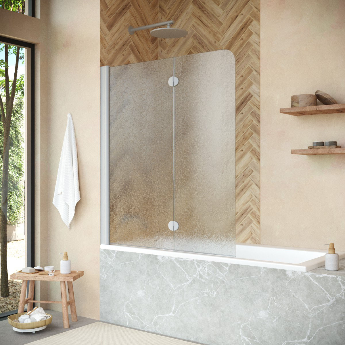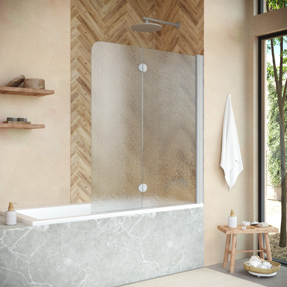 Стеклянная шторка Vegas-Glass E2V NOVO может быть выполнена в различных вариантах стекла. Это позволяет легко адаптировать продукт к индивидуальному стилю ванной комнаты и создать необходимый уровень приватности.