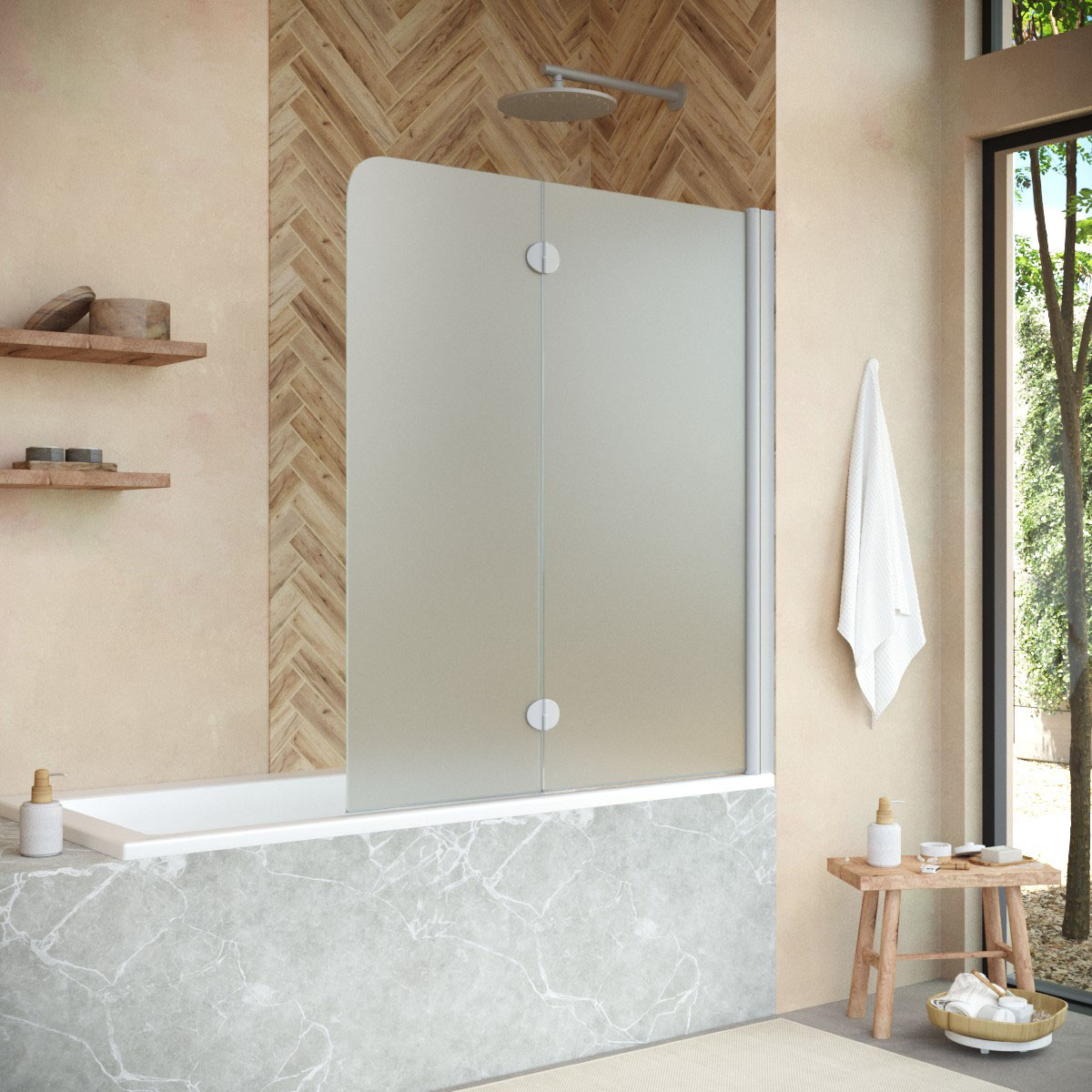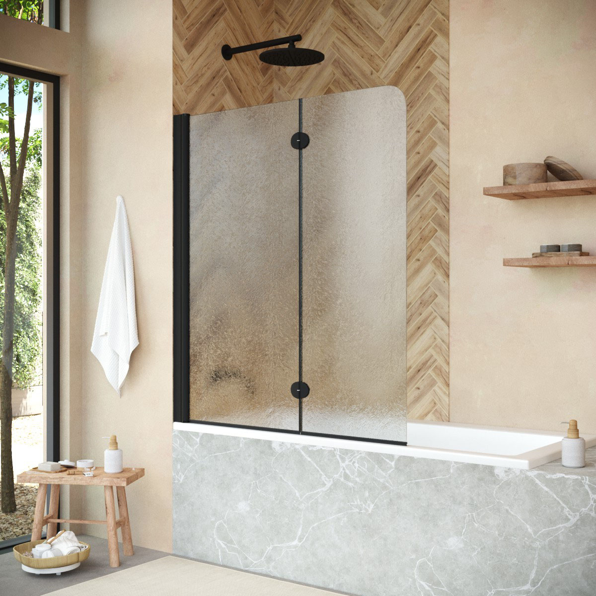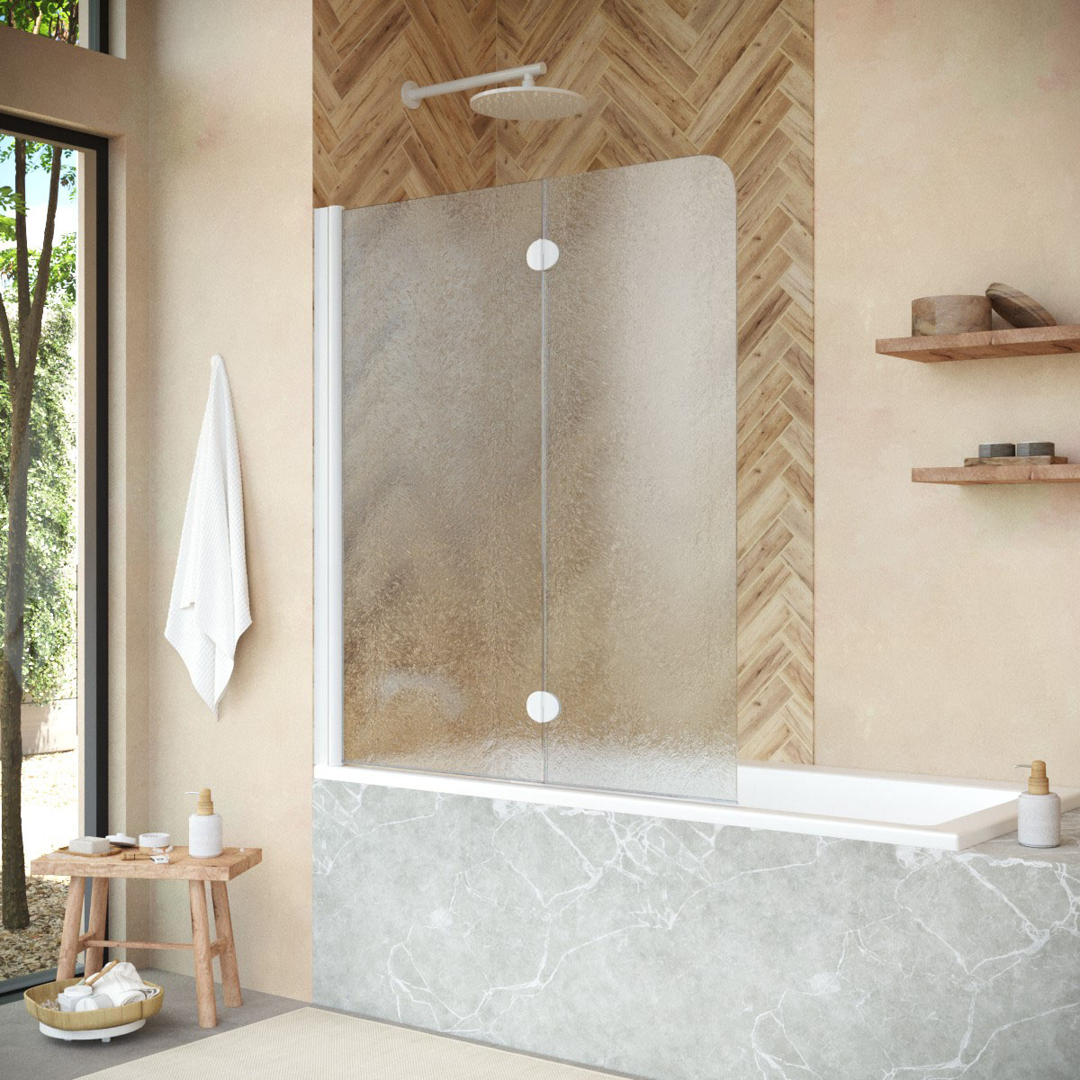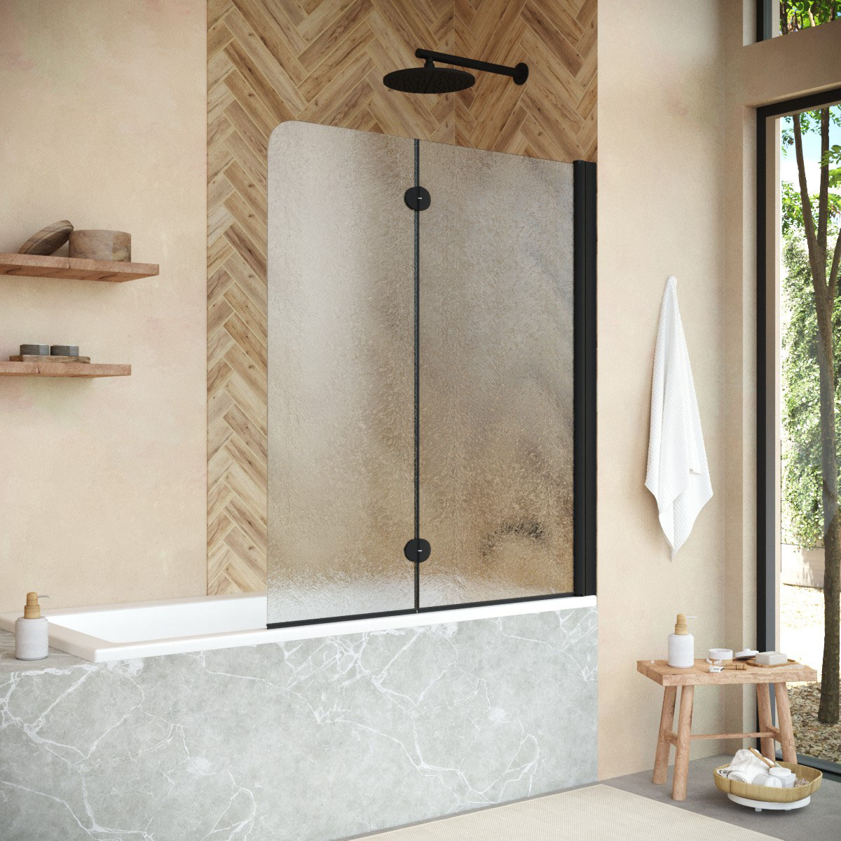 Стеклянная шторка Vegas-Glass E2V NOVO может быть выполнена в различных вариантах стекла. Это позволяет легко адаптировать продукт к индивидуальному стилю ванной комнаты и создать необходимый уровень приватности.