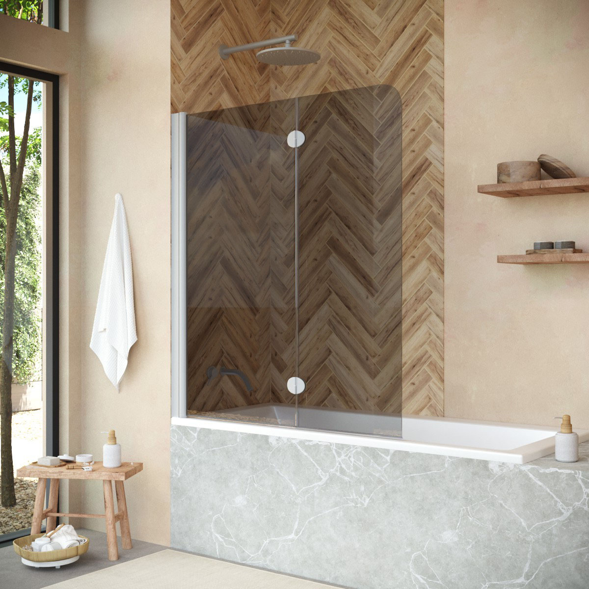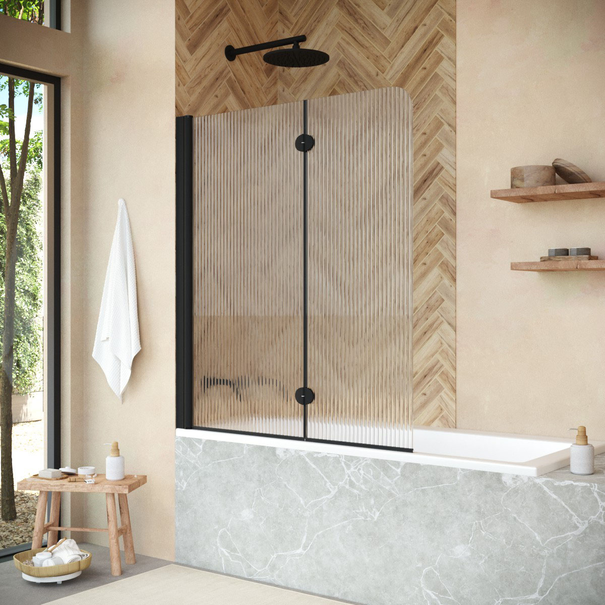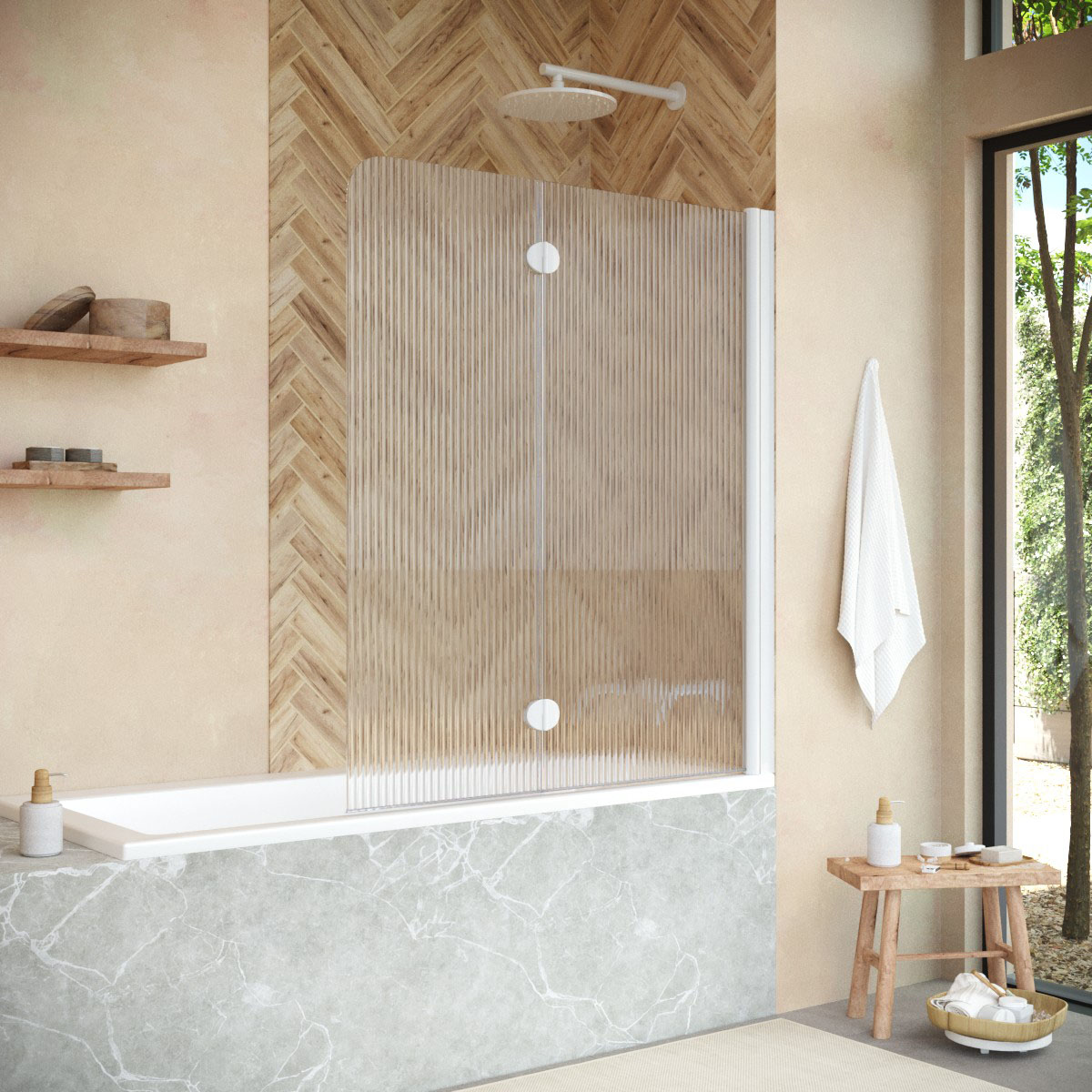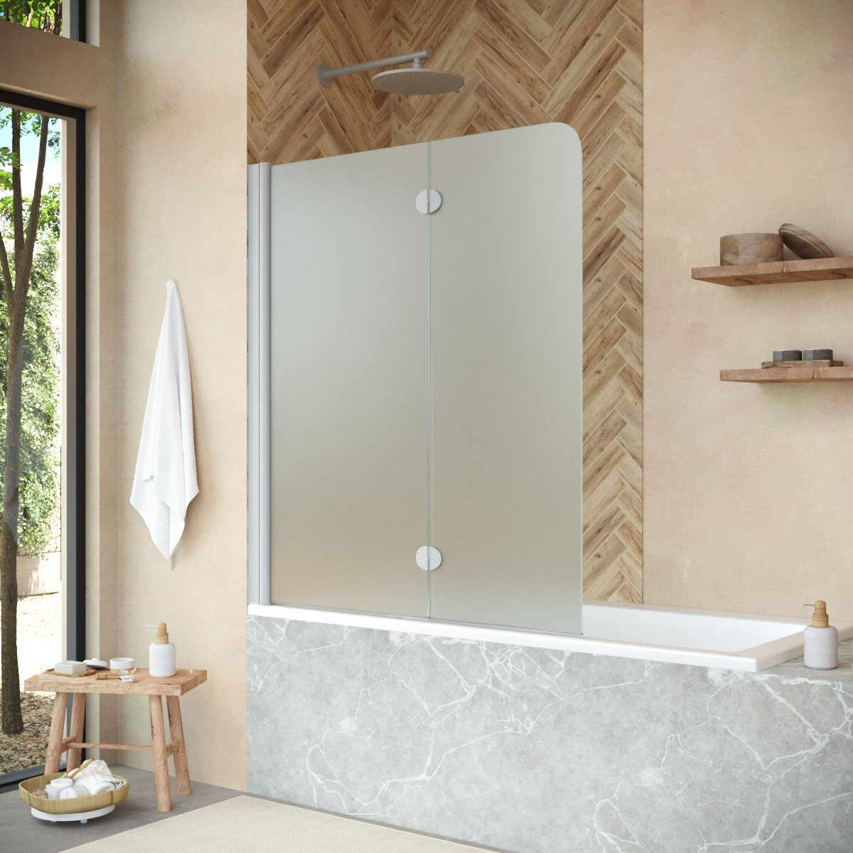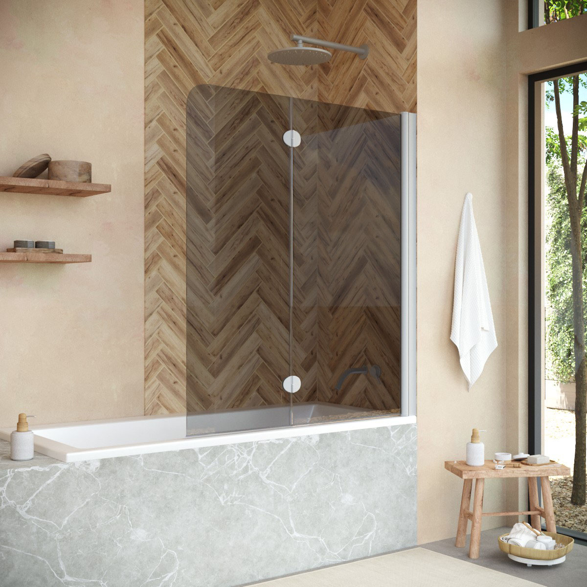 Стеклянная шторка Vegas-Glass E2V NOVO может быть выполнена в различных вариантах стекла. Это позволяет легко адаптировать продукт к индивидуальному стилю ванной комнаты и создать необходимый уровень приватности.