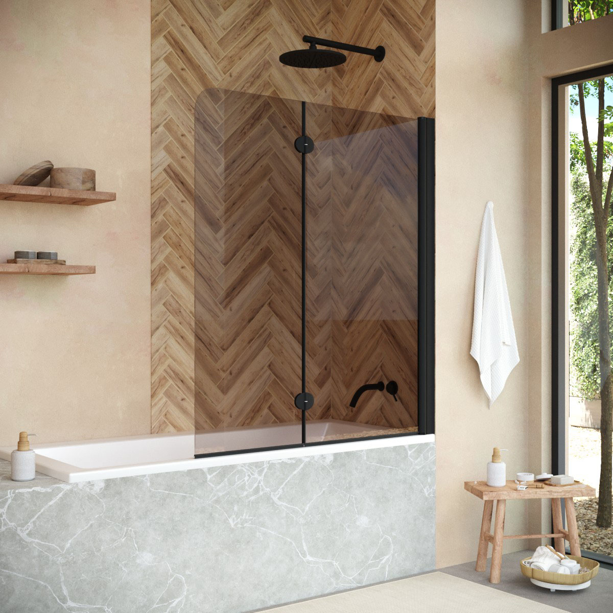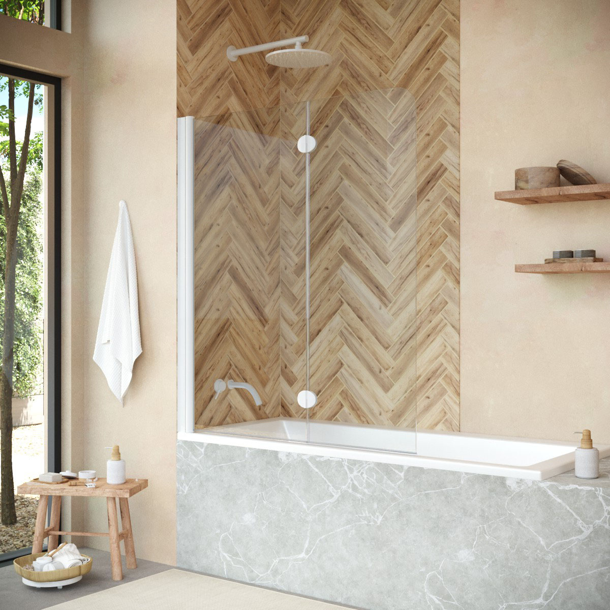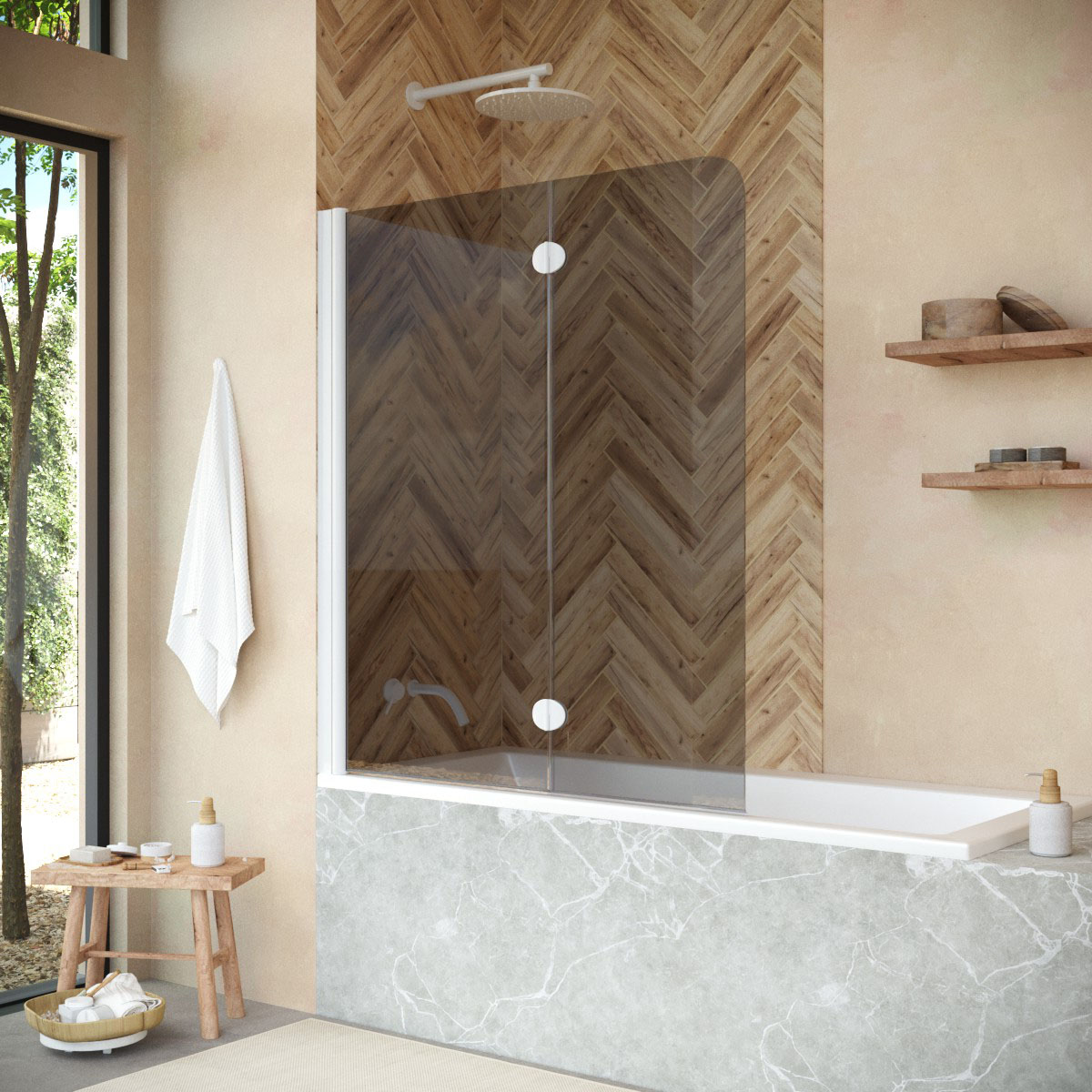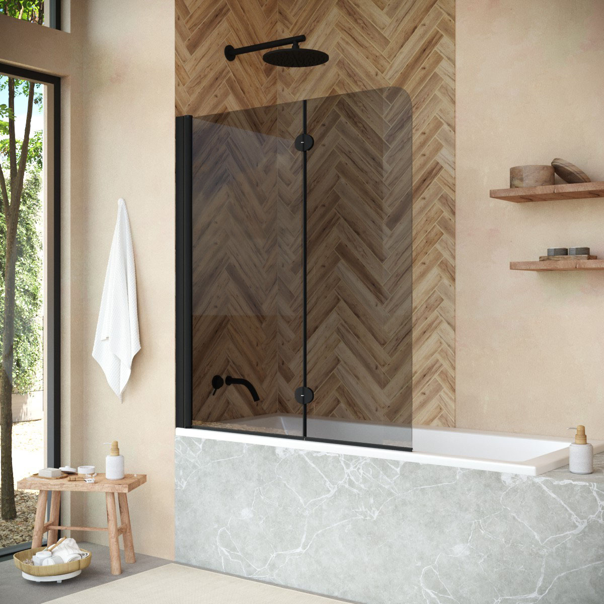 Стеклянная шторка Vegas-Glass E2V NOVO может быть выполнена в различных вариантах стекла. Это позволяет легко адаптировать продукт к индивидуальному стилю ванной комнаты и создать необходимый уровень приватности.