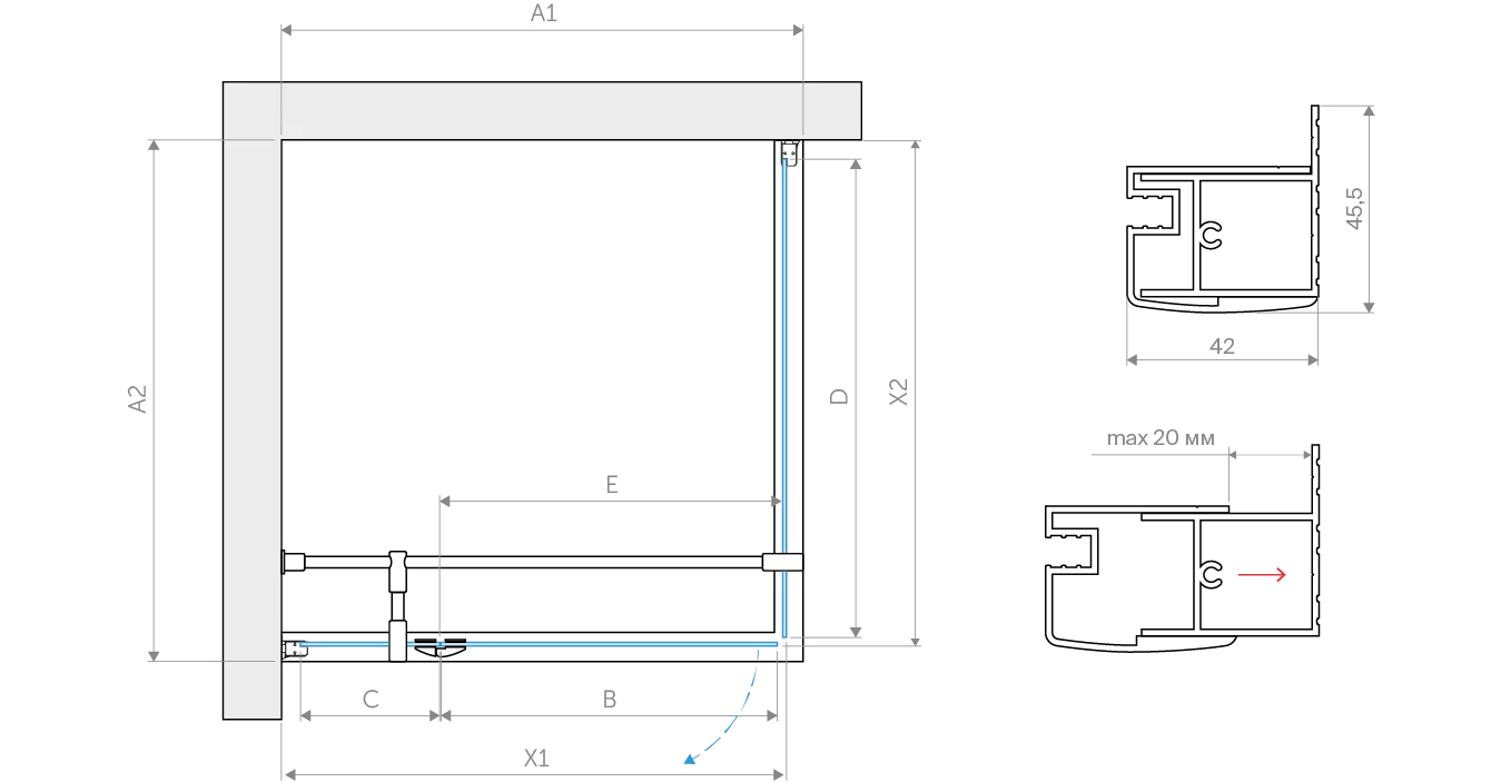 3. Распашная дверь: Распашная дверь обеспечивает легкий доступ в душевую зону и является удобной в использовании. Также она позволяет максимально эффективно использовать пространство в ванной комнате.